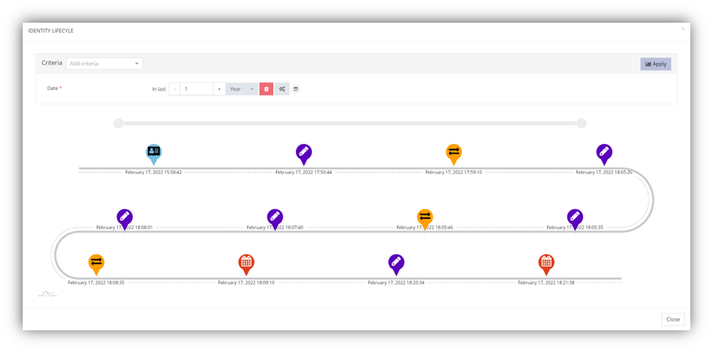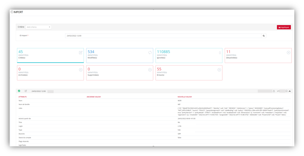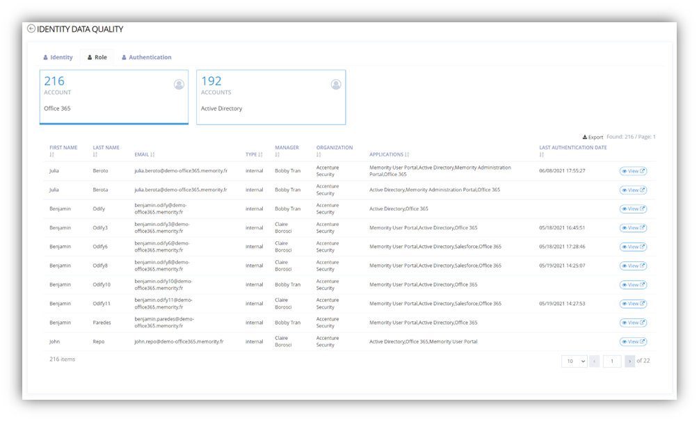 Identities data, organizations and all other objects managed in Memority can be replicated in the Memority Reporting databases and historicized over a one-year period. This capability allows clients to go back in time and consult the state of an identity at an earlier date.