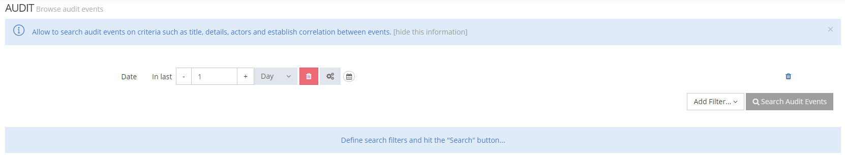 The Audit allows to search for audit events on criteria such as title, details, actors... and establish correlation between events.