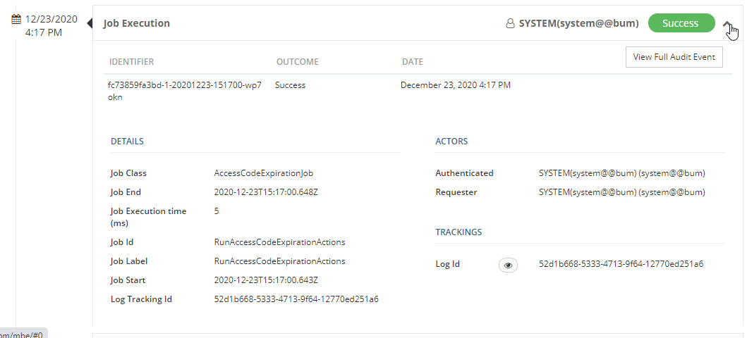 View an Audit Event | You can view details of audit events by clicking on the arrow displayed on the line. By clicking on the "View Full Audit Event", you can view more information about the event. | ![]() |