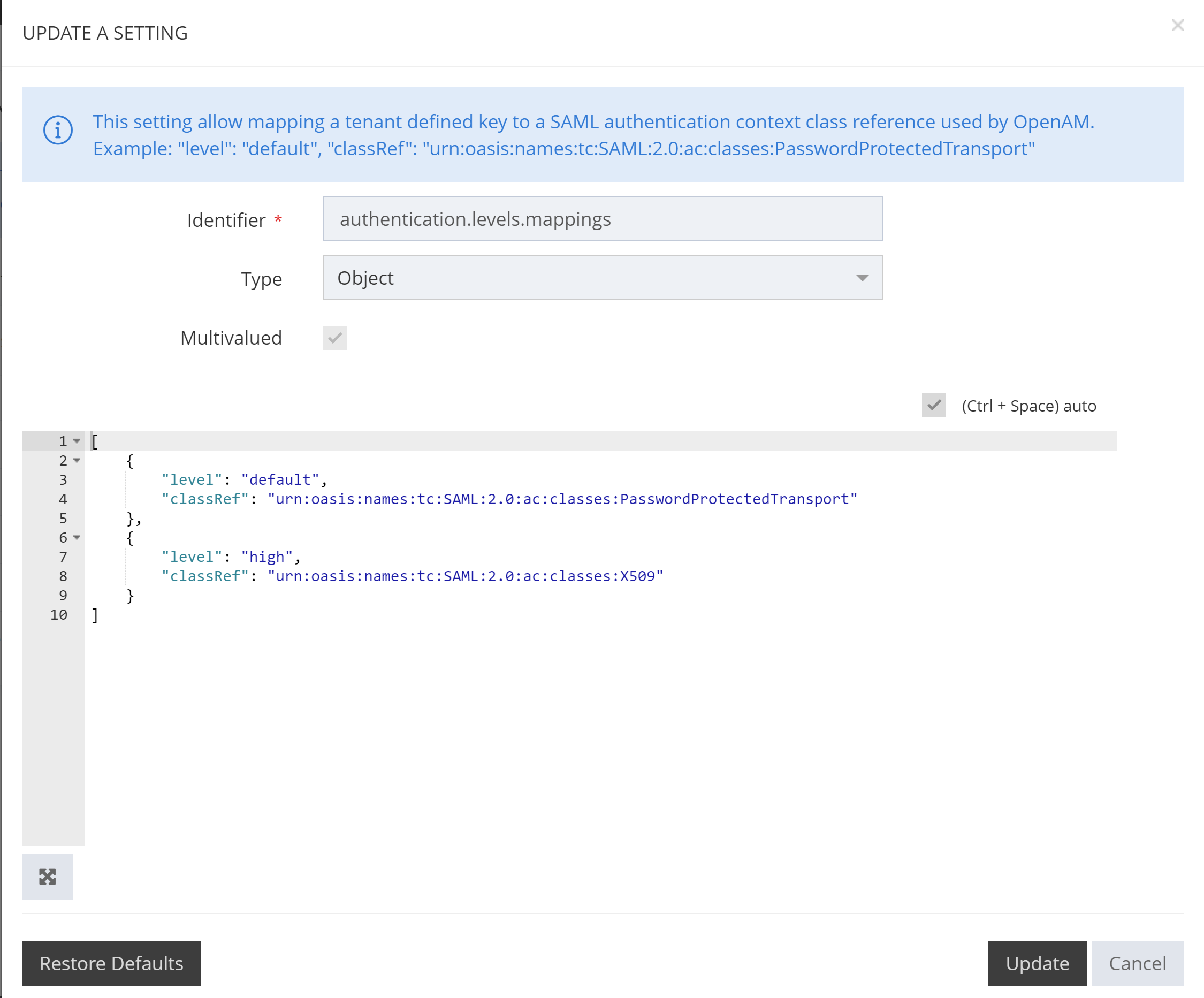 To configure Authentication Levels, one must declare them in the Setting authentication.levels.mappings.