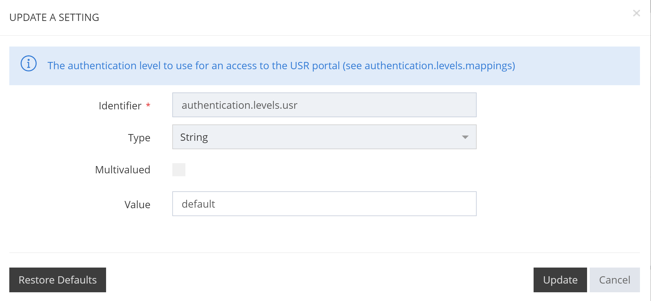Administration Portal > System > Settings > Business Service > Search for “authentication.levels.mappings” and edit the value