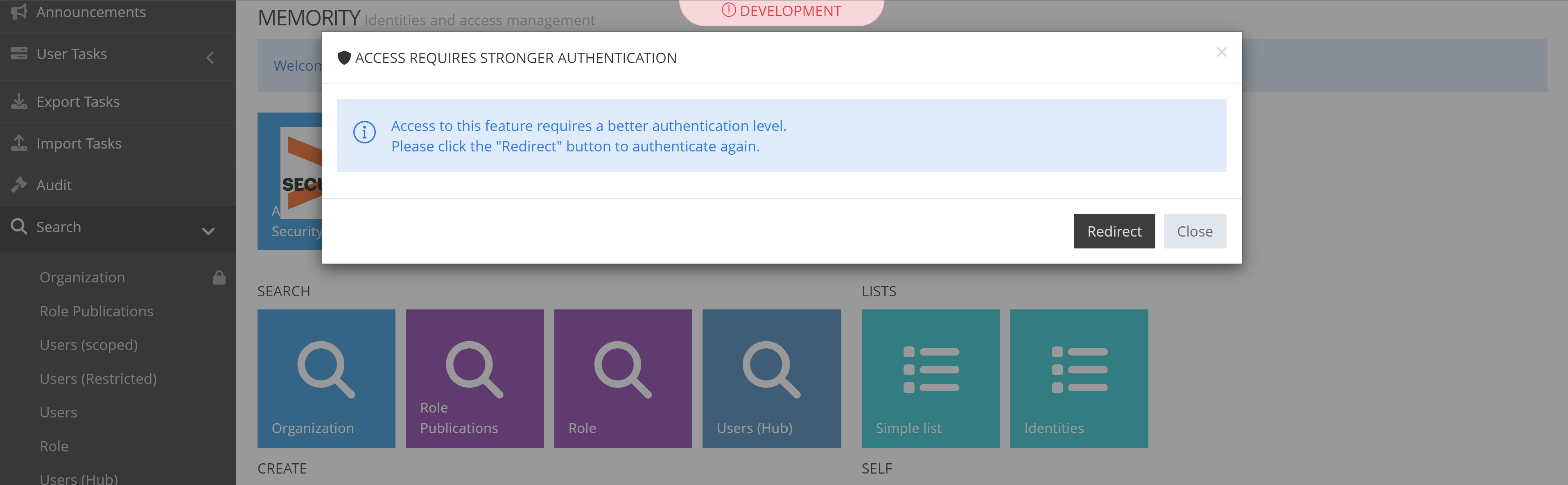 The prompt of a message indicating that a new and/or stronger authentication is required by the user, followed by a redirection to the authentication platform, is referred to as an “Authentication step-up” or just “Step-Up”.