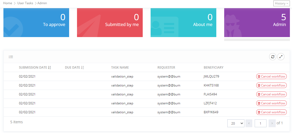 | 6 | Access the Workflow dashboard on the User Portal to see all identities concerned by the user task. ![]() |