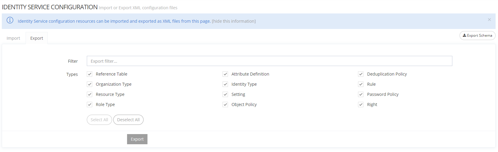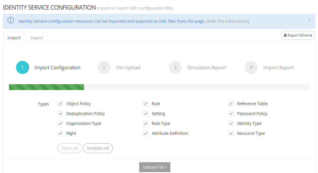 <service> represents any service trigram that support dataset import: (i18n, amcp, aud, bum, idm, ntf, rep, sync, tnt). <params> are query parameters import options: mode: IMPORT (existing items are updated, new one are created), CREATE (Create only, existing items are left untouched), UPDATE (Update only, new items are skipped). execution: SYNC (The import is done synchronously in one HTTP request, this is only suitable for small imports) ASYNC (The import is done asynchronously, this is suitable for large import and is the default execution when using the UI) In all cases, the progress can be followed using the dedicated endpoint (see below). simulation: true, false If true, the import will only be simulated and no changes will be commited. filterTypeNames: An optional list of type names to filter out the dataset. Only those items that implement the type will be imported. filterTypeClasses: An optional list of type classes to filter out the dataset. Only those items that implement the type classes will be imported. Has precedence over filterTypeNames. | The XML configurations. | A (complete or partial) import result. The result will be partial and returned immediately if the execution is ASYNC. Contains an id which allows to track progress. | Import XML configurations |