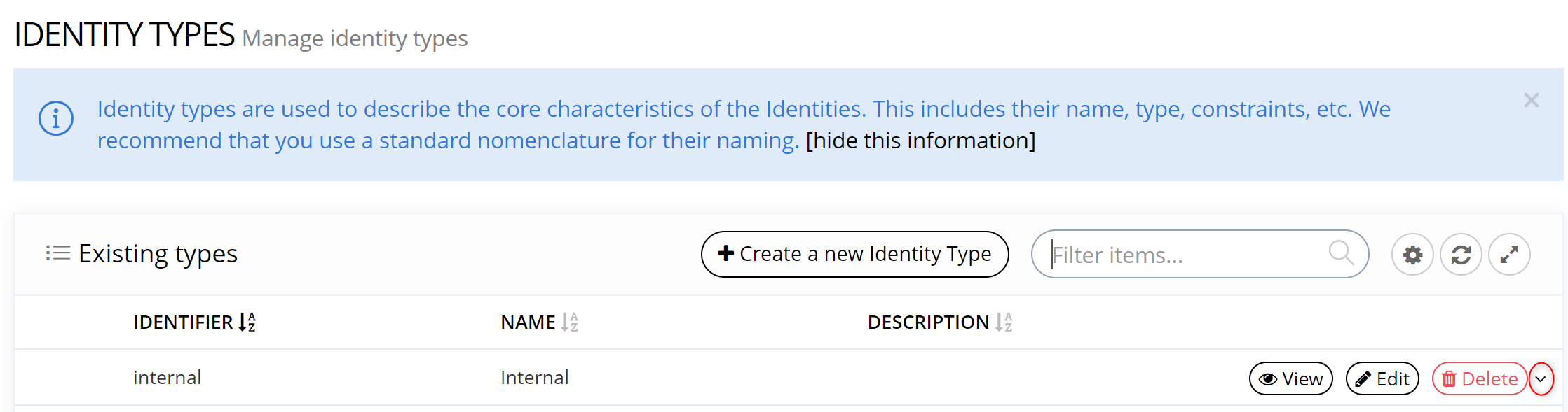 It allows to configure the Attributes that will be reused to value the Object Types (Identity, Organization, Resource, Role, Role Publication).