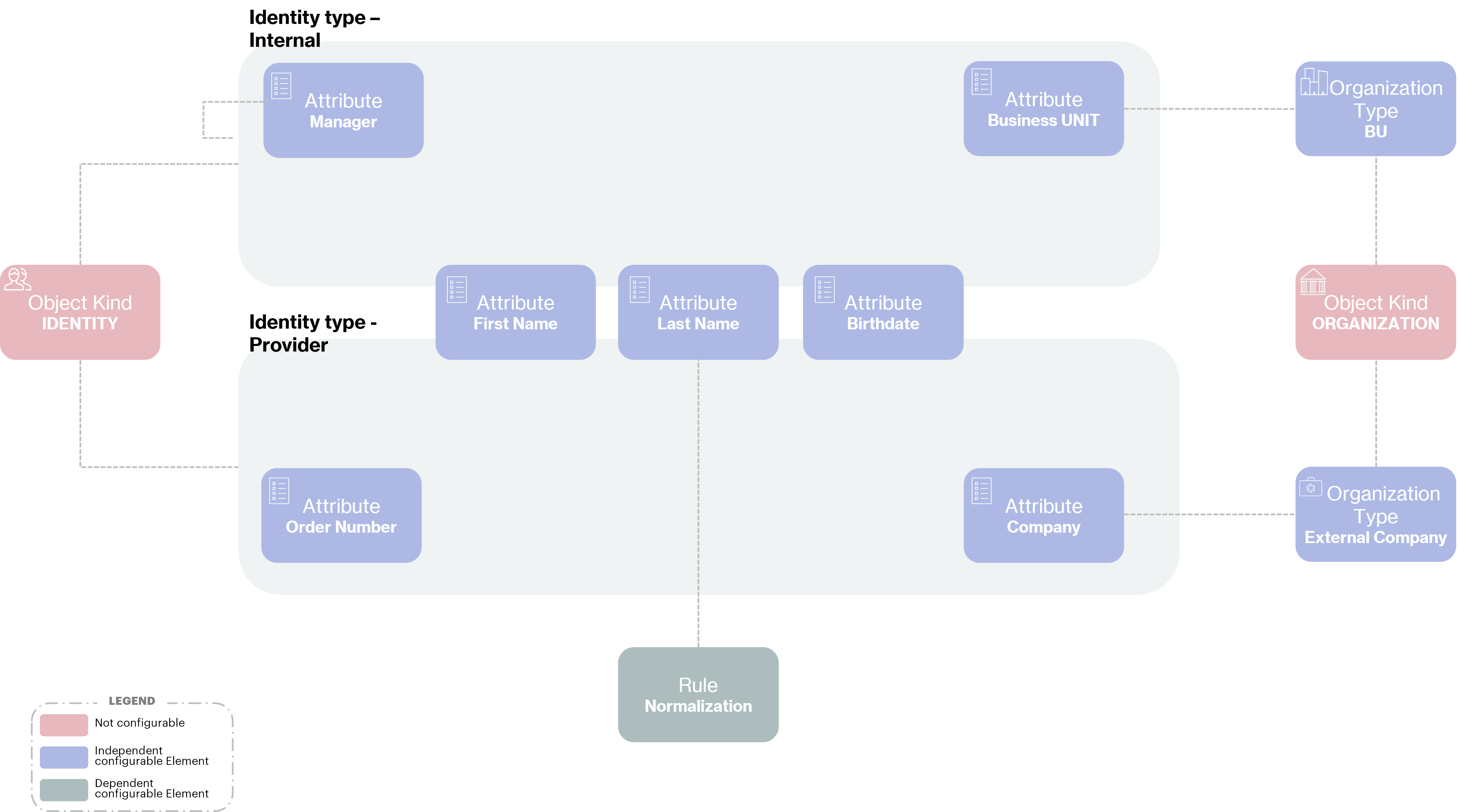 In the same way as we have just presented the identity types, each of the organization types can be configured to describe the specific attributes attached to it.