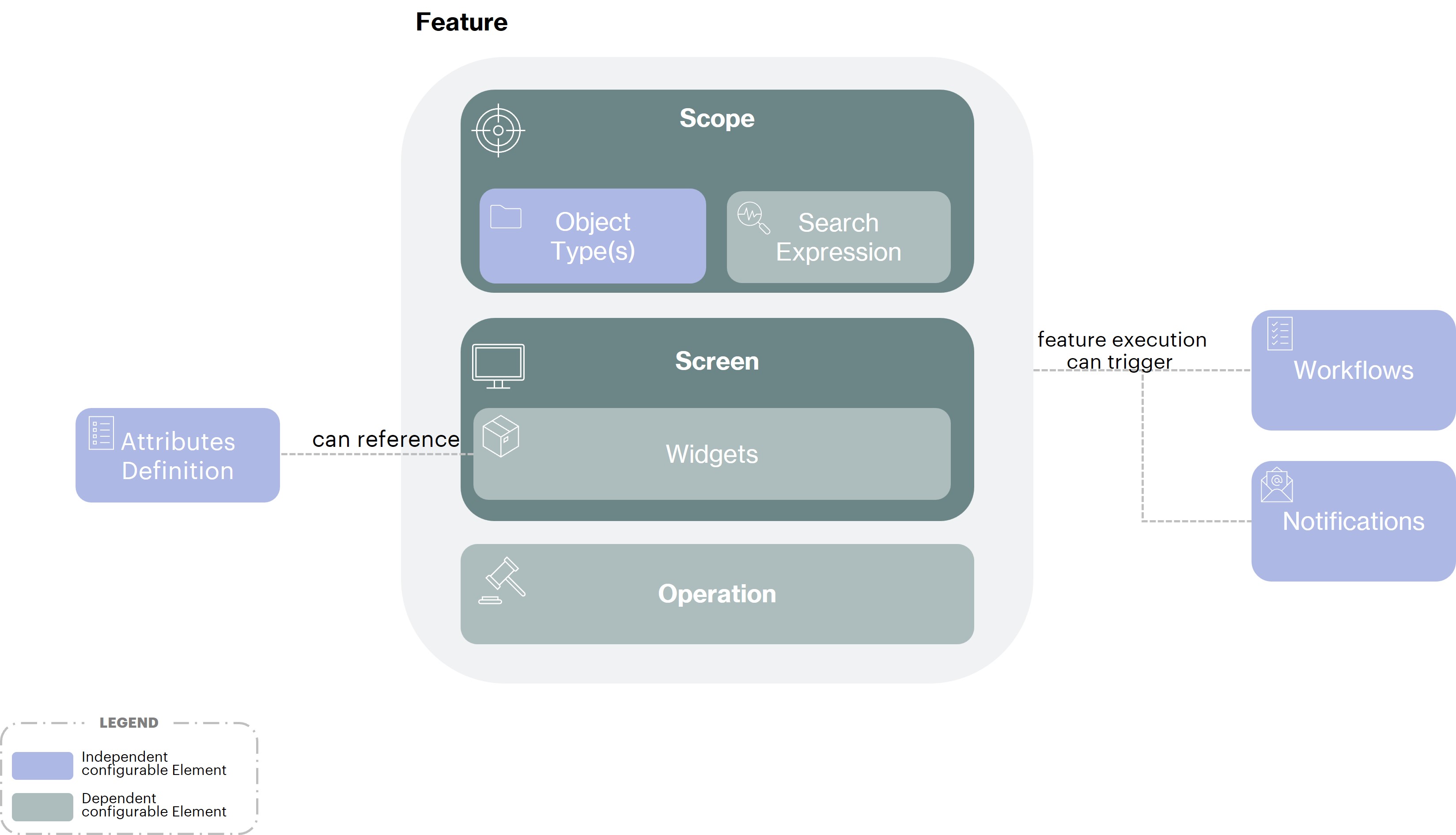 A Feature is accessed by the user on the Memority Portal on /features/<feature id> after a permission check on the Subject and where the Screen is rendered with the configured elements and the operation actions displayed.