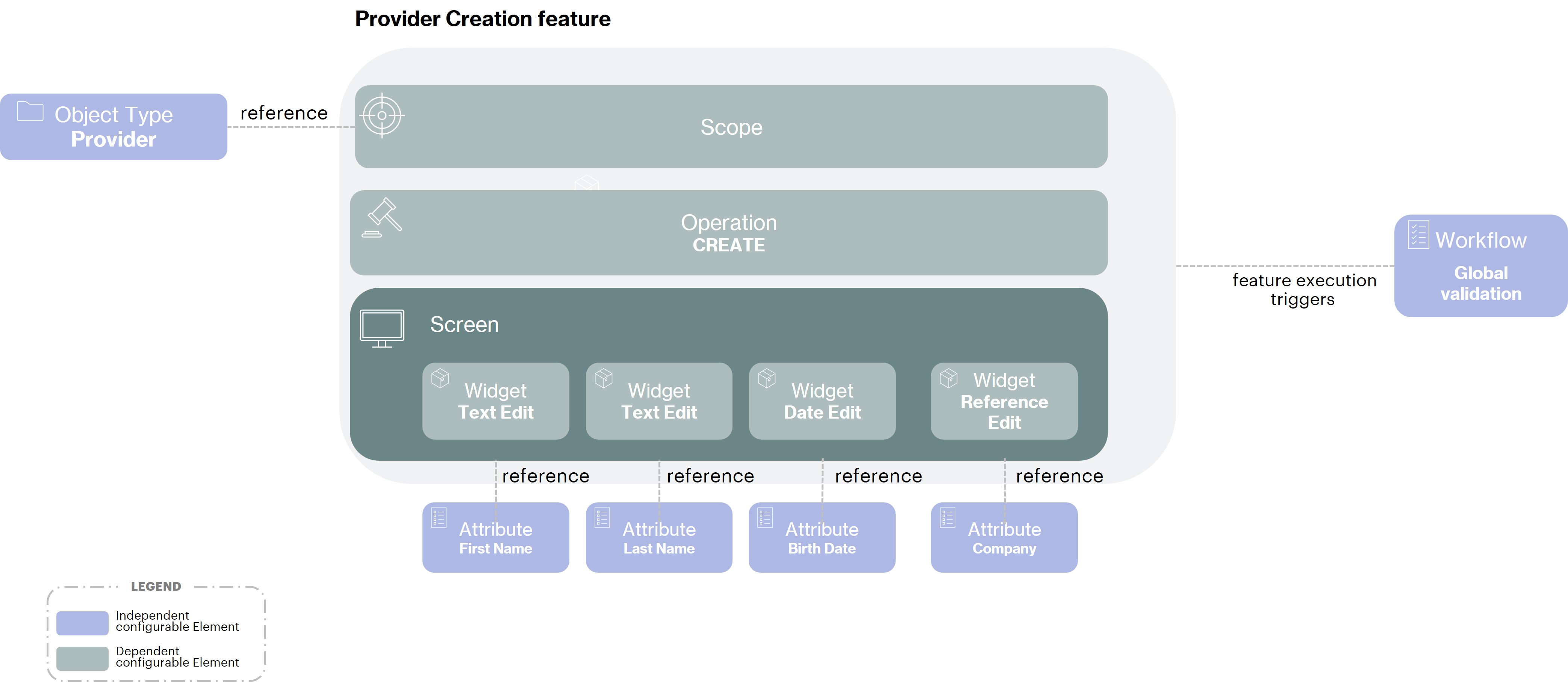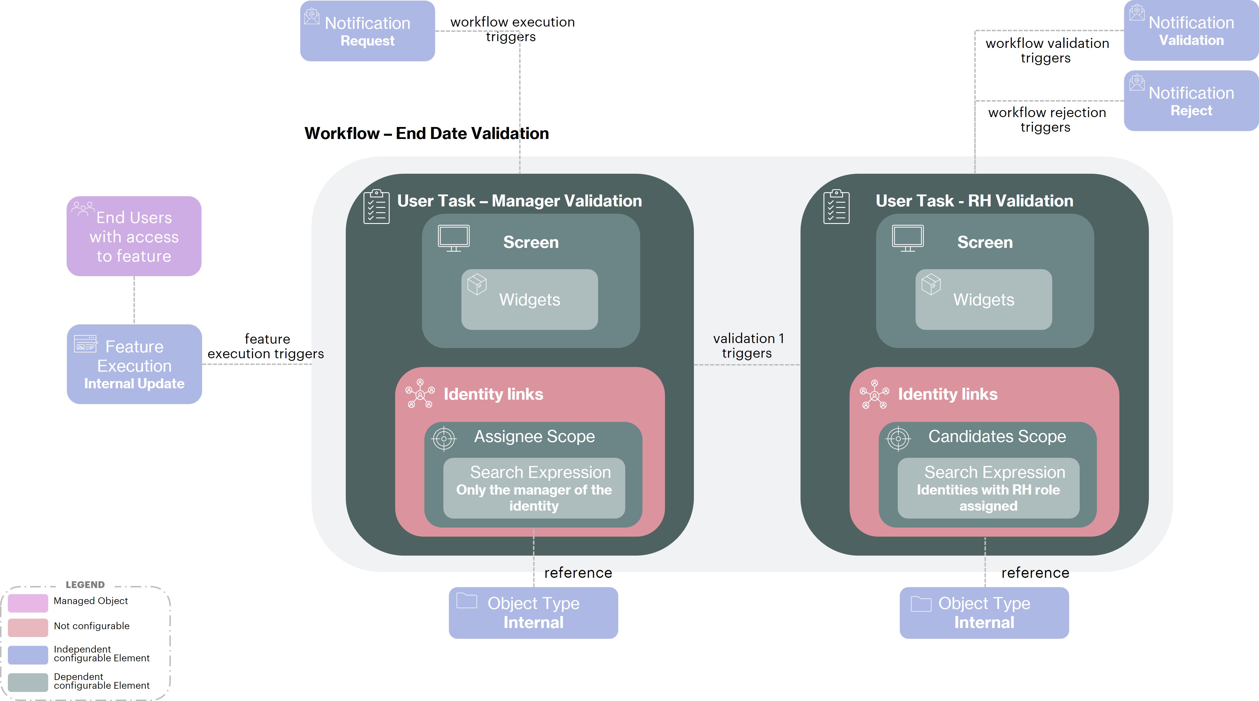 In this example the workflow is triggered by the submission of the feature but this is not always the case. Indeed, we could imagine a validation process for the end date of an identity that would be triggered in a programmed way 10 days before the end date in order to validate that the date is still correct. This type of process will be implemented through a Business Policy.