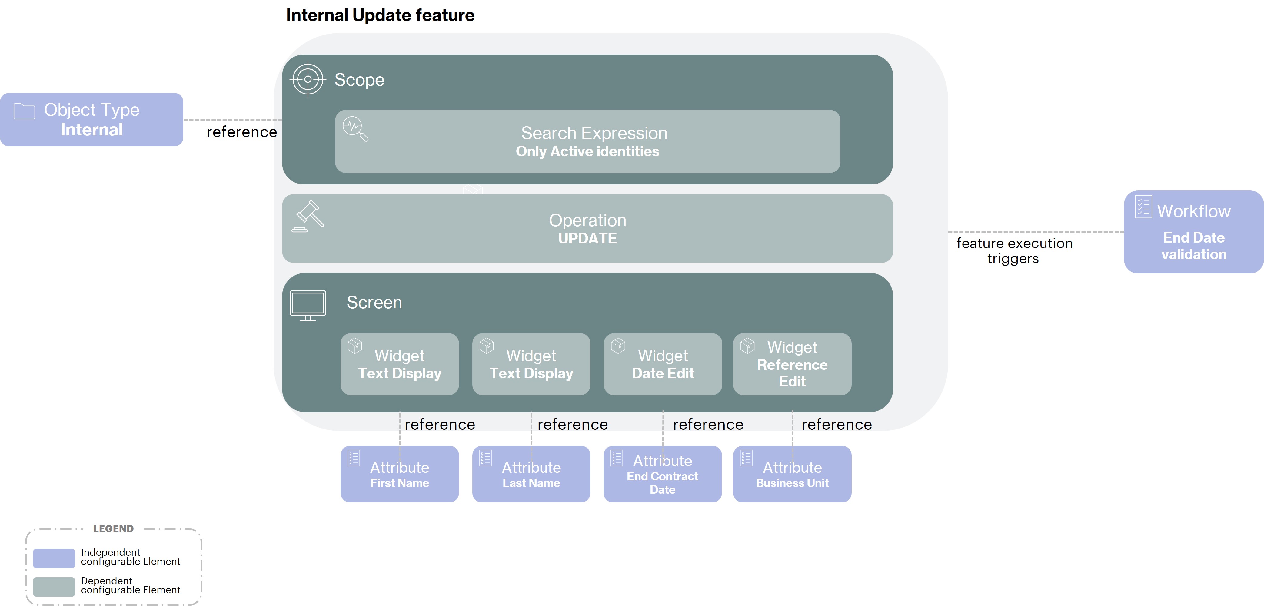 displaymode and others ineditmode to allow the visualization of certain attributes (not modifiable in the context of this functionality) and the edition of values for other attributes associated with the internal identity typeFinally, in the configuration of this functionality we will associate the validation Workflow of modification of the end date of the internal. Thus, after the submission of the functionality, all the modifications will be taken into account immediately, except for the modification of the