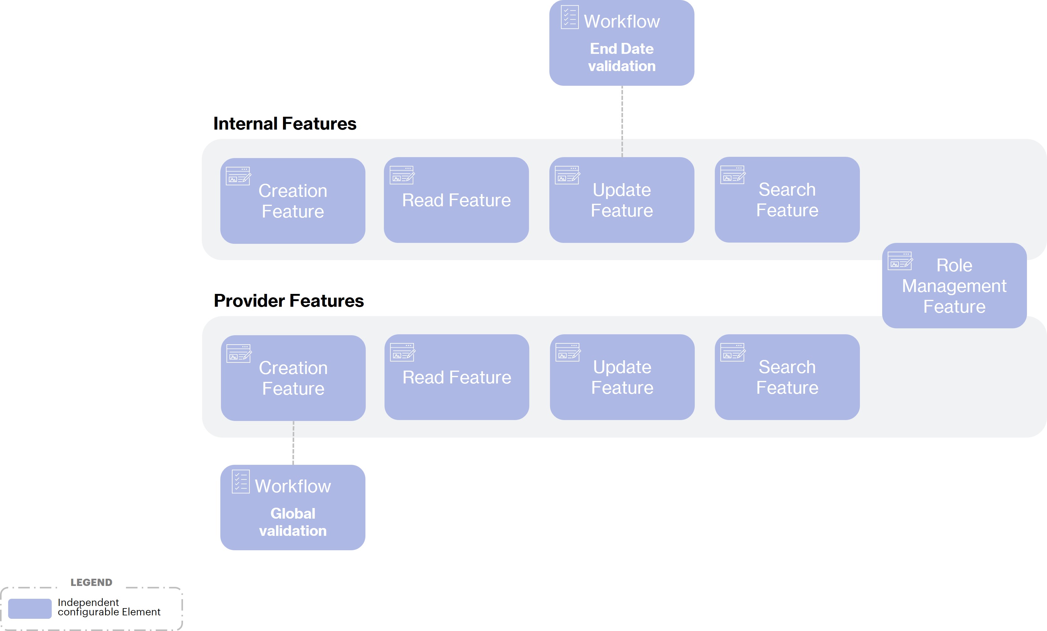 Since the two types of identities have different characteristics in terms of attributes, validation process or management perimeter, most of the functionalities must be dedicated to one type of identity. As shown in the following diagram, the only exception in this use case will be the visualization and role assignment functionality where the characteristics will be the same and therefore the functionality (Feature) can be common.