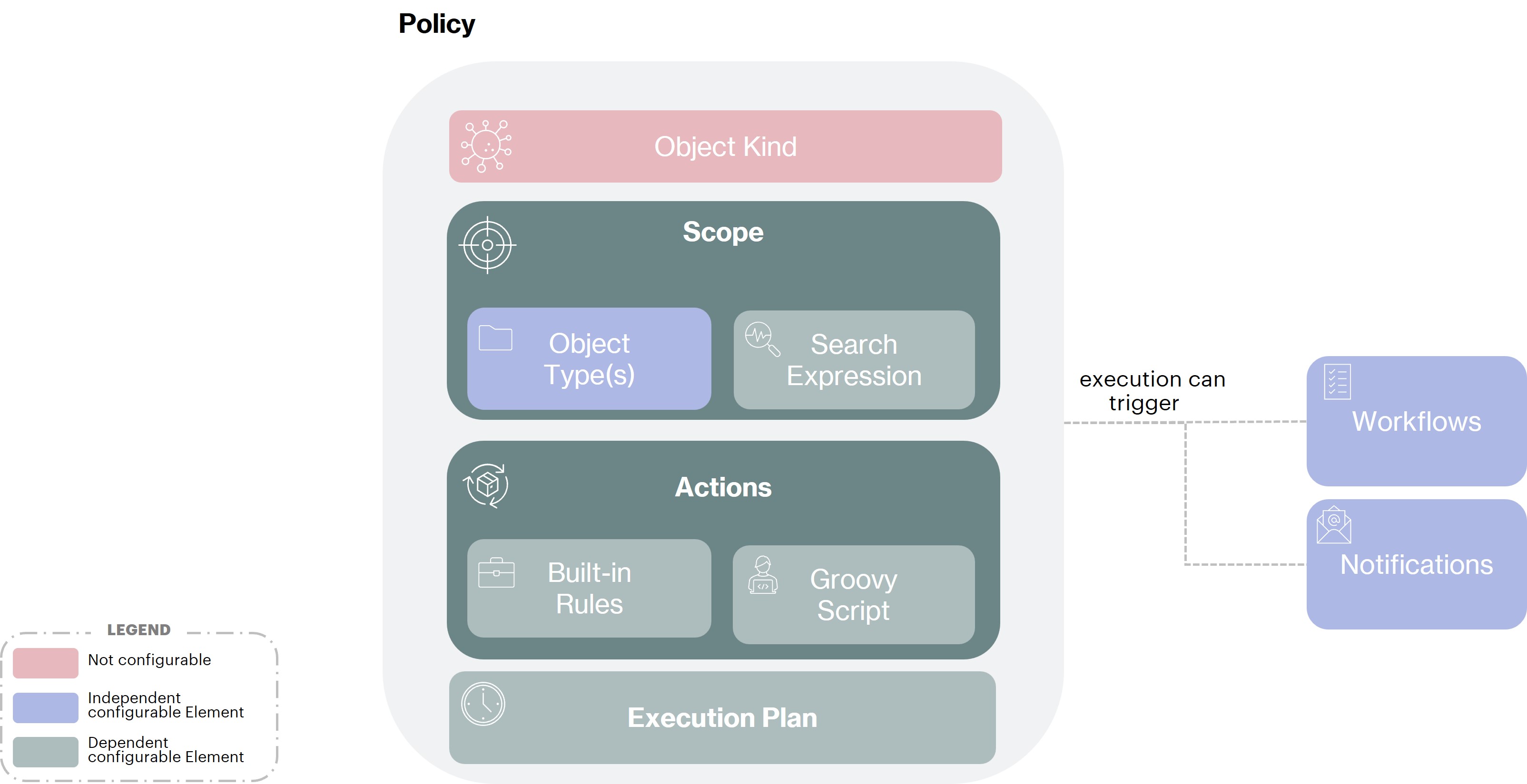A Policy is a set of rules that apply to a scope of managed objects. These rules or actions can be executed periodically or when an object (which belongs to the scope of the policy) triggers an event (such as being updated).