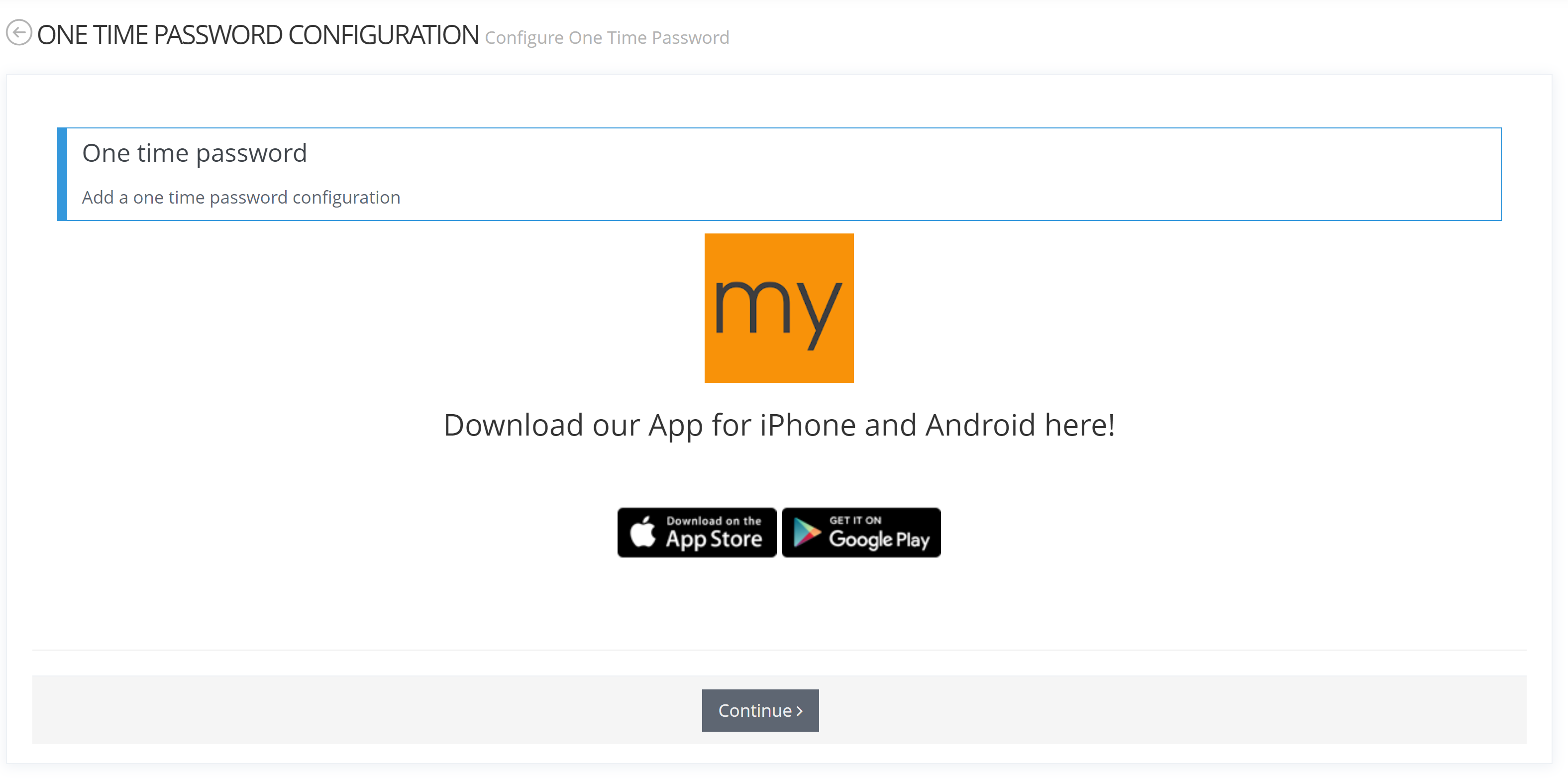 The user is presented with a screen that invites him to proceed to a "One Time Password" registration. He can click the store links to obtain the recommended application (Google Authenticator, MS authenticator etc.).