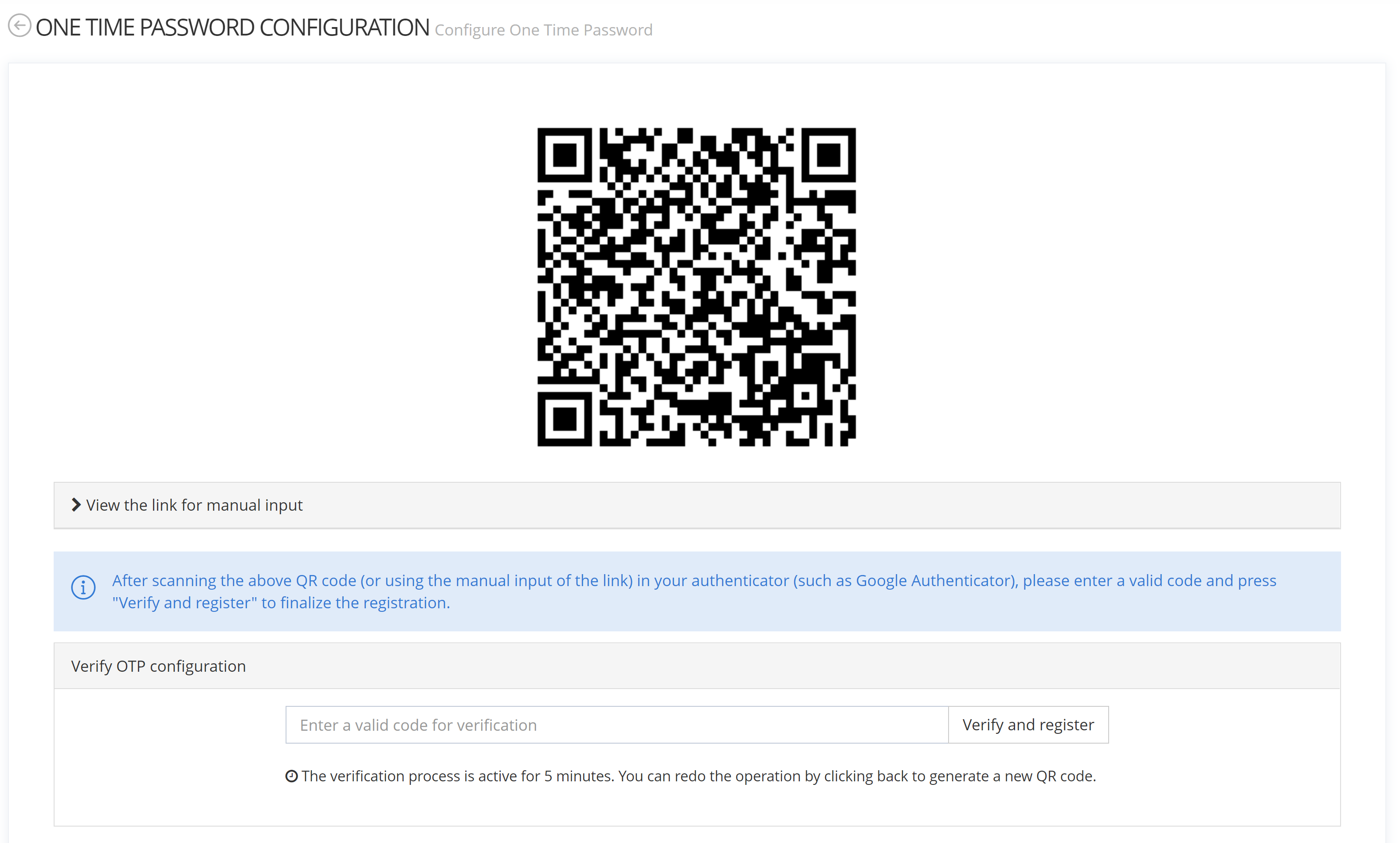 After registering the QR code, the user needs to provide a valid TOTP code in the field at the bottom using his application. If the code is correct the user will be informed that the registration is complete.