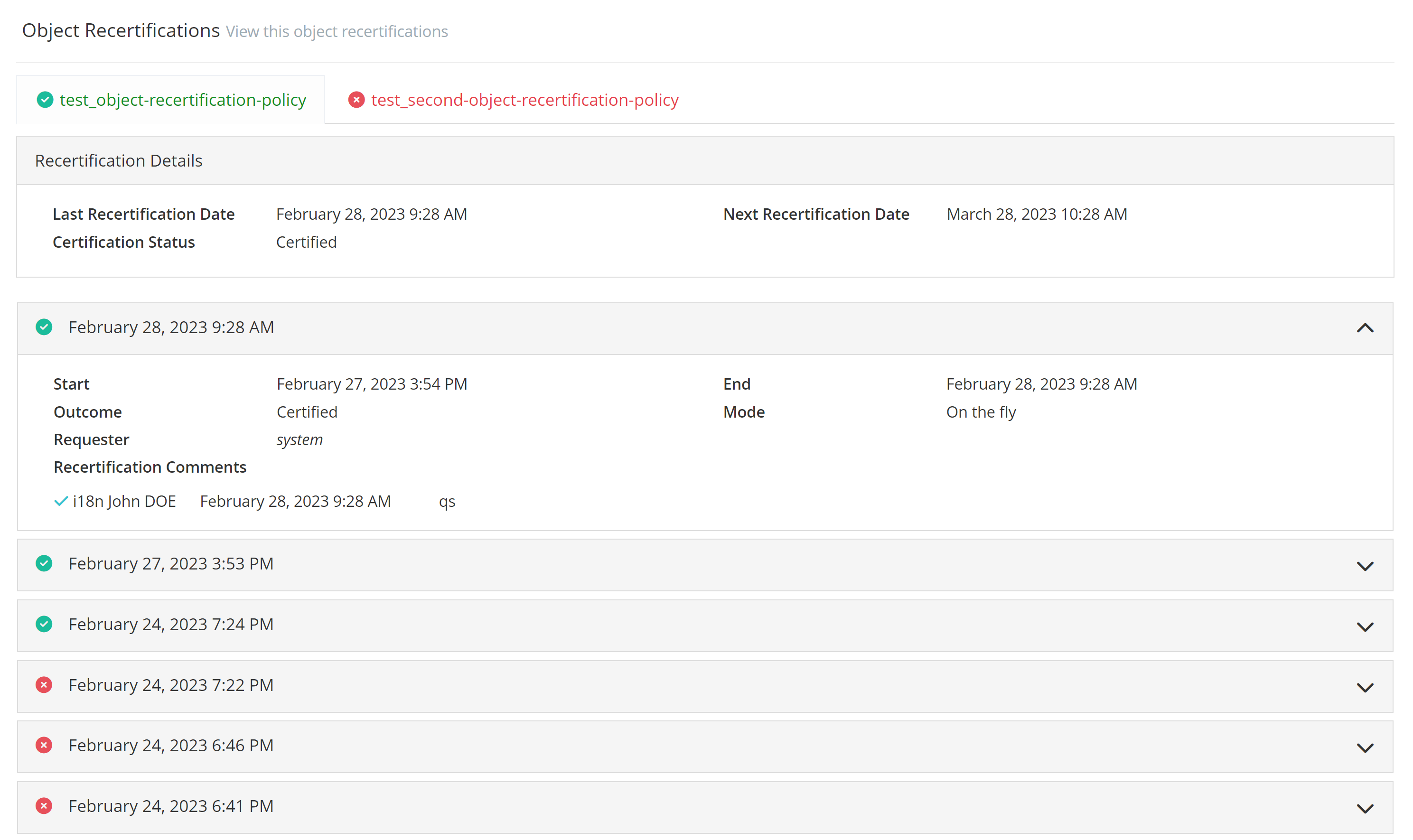 The widget will display one tab per matching policies for the object. If the last recertification has a “CERTIFIED” status it will appear in green with a check mark, otherwise if the status is “REFUSED” it will appear in red with a cross.
