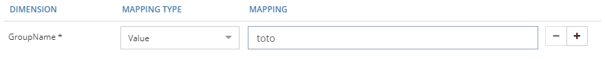 | The dimension value is explicitly set in the mapping. If the dimension is multivalued, it is possible to add several values. In this case, the dimension will never be displayed (on the Role Assignment widget or on the Role Dashboard) even if a tag has been defined. | ![]()