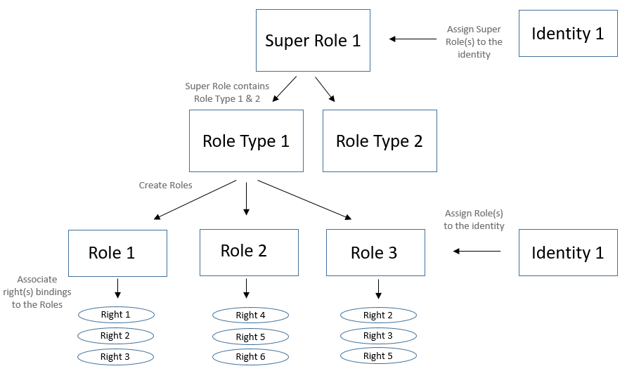 A Role or a Super Role are given to an Identity through the assignment of a Role.