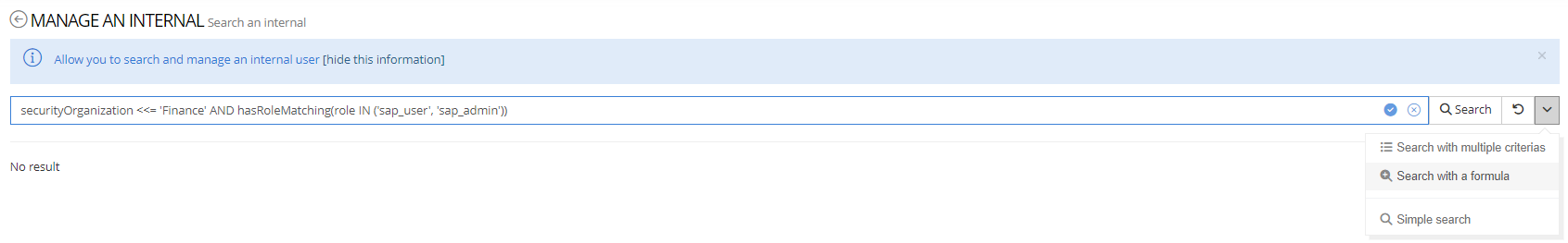 securityOrganization <<= 'Finance' AND hasRoleMatching(role IN ('sap_user', 'sap_admin'))
