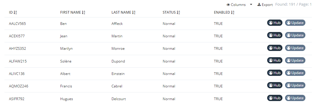 - | YES | Allows to define the properties of each attributes which will be displayed. All listed attributes in the columns will be searchable in the search form. By clicking on the "Columns" button, you can display others columns (that are configured as hidden). | - |