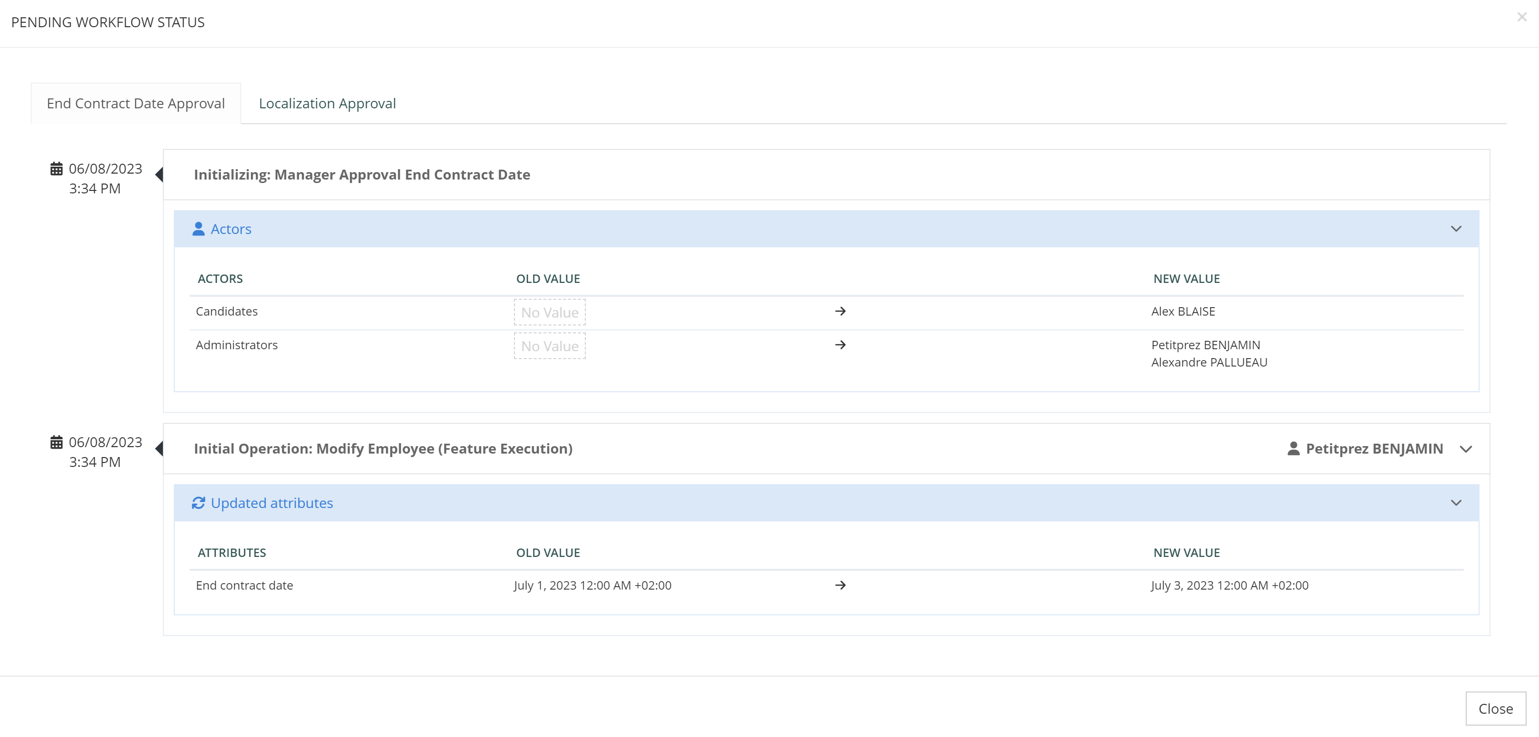 The widget retrieves all workflows currently pending on an object and displays a tab for each of them. The tab name is defined by a convention of i18n keys that will be applied in the following order:
